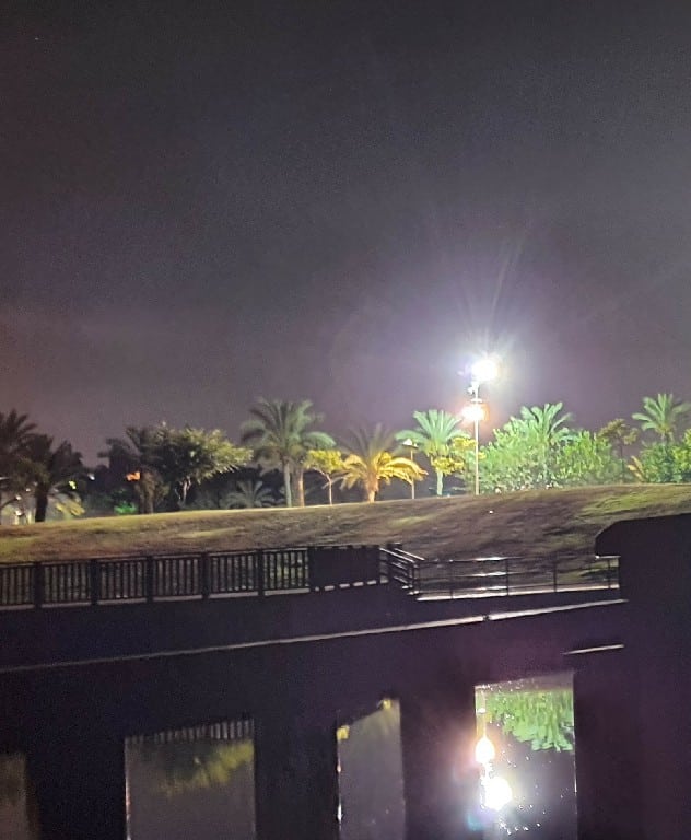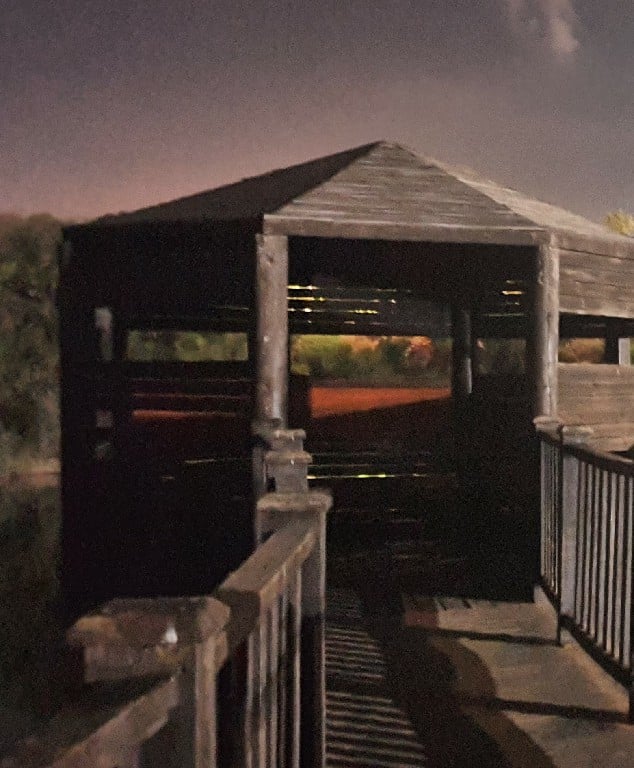 גשר מעץ מוביל לבקתה קטנה מעל המים, ומאפשרת לצפות בציפורים המגיעות לאגם ובברווזים השוחים בו.