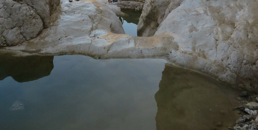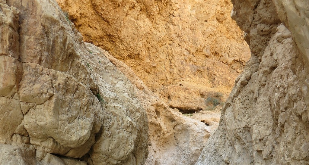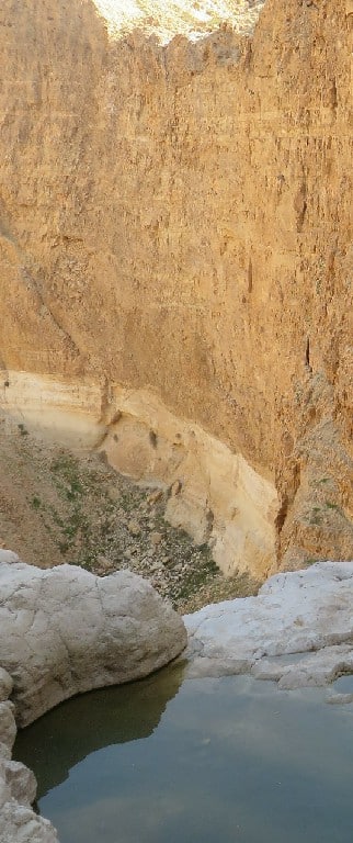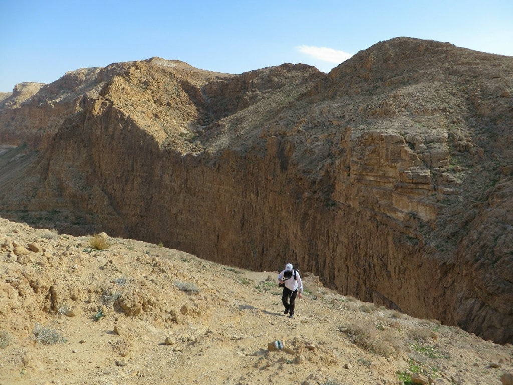 מיד לאחר חציית הערוץ מטפסים ימינה בשביל הכחול ויורדים ימינה בשביל הירוק (בעזרת יתדות) לגב.